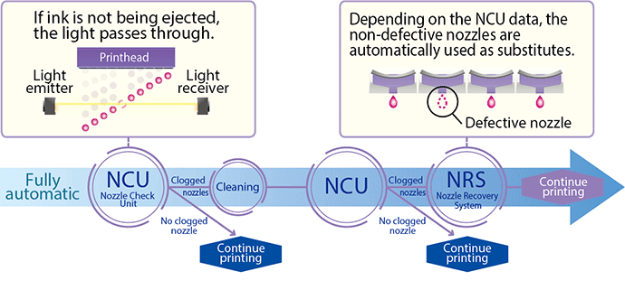 Unattended printing with Mimaki’s Nozzle Check Unit and the Nozzle Recovery System. The NCU automatically cleans the print head when nozzles malfunction. When nozzles are not repairable, printing can continue by the use of another nozzle, without the loss of productivity or a reduction in print quality.