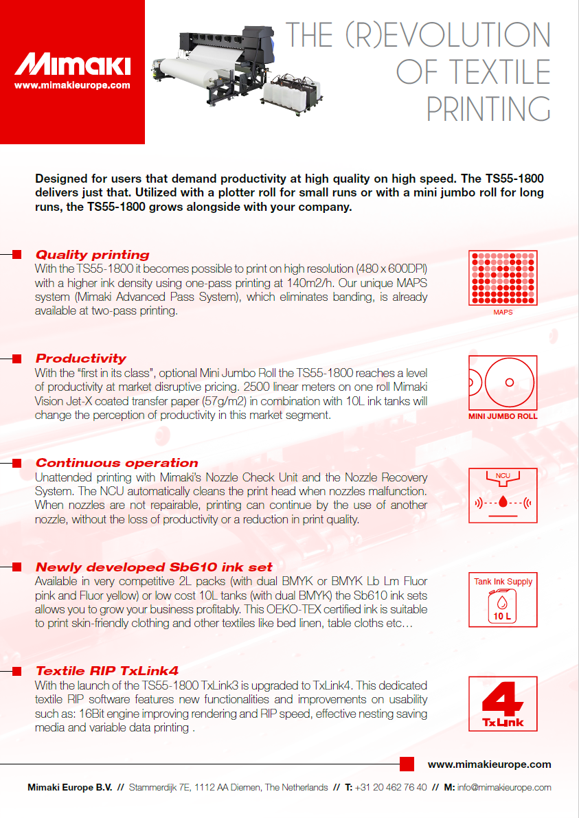 With the “first in its class”, optional Mini Jumbo Roll the TS55-1800 reaches a level of productivity at market disruptive pricing. 2500 linear meters on one roll Mimaki Vision Jet-X coated transfer paper (57g/m2) in combination with 10L ink tanks will change the perception of productivity in this market segment.